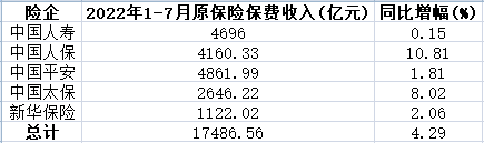 中国经济网北京8月15日讯 A股五大上市保险公司近日已全部披露2022年1-7月保费收入(指原保险保费,下同)。中国人寿、中国人保、中国平安、中国太保和新华保险5家公司前7个月合计实现保费收入17486.56亿元,较上年同期的16767.89亿元增长4.29%。