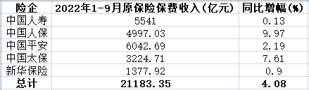 中国经济网北京10月20日讯 A股五大上市保险公司于近日披露了2022年1-9月保费收入(指原保险保费,下同),中国人寿、中国人保、中国平安、中国太保和新华保险累计实现原保险保费收入21183.35亿元,同比增长4.08%。