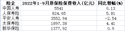 前三季度,五大上市险企保费收入均实现正增长,中国人寿、中国人保、中国平安、中国太保和新华保险保费收入同比增幅分别为0.13%、9.97%、2.19%、7.61%和0.90%。