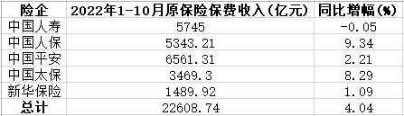 具体来看,中国人寿、中国人保、中国平安、中国太保和新华保险2022年前10个月保费收入分别为5745亿元、5343.21亿元、6561.31亿元、3469.30亿元和1489.92亿元,同比分别增长-0.05%、9.34%、2.21%、8.29%和1.09%。
