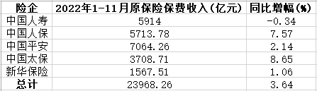 中国经济网北京12月16日讯 2022年1-11月,A股五大上市保险公司保费收入(指原保险保费收入,下同)合计达23968.26亿元,同比增长3.64%。