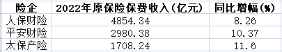 人保财险、平安财险和太保产险全年实现保费收入分别为4854.34亿元、2980.38亿元和1708.24亿元,同比增幅分别为8.26%、10.37%和11.60%。