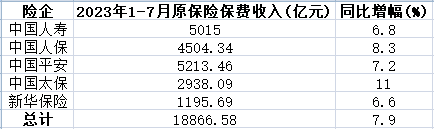 A股五大上市险企前7月保费1.89万亿元 同比增长7.9%
