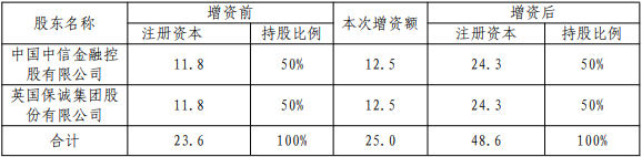 本次增资后,公司注册资本将达到人民币48.6亿元,中国中信金融控股有限公司合计出资人民币24.3亿元注册资本,占公司注册资本的50%;英国保诚集团股份有限公司合计出资人民币24.3亿元注册资本,占公司注册资本的50%。上述变更注册资本事项待国家金融监督管理总局批准后生效。