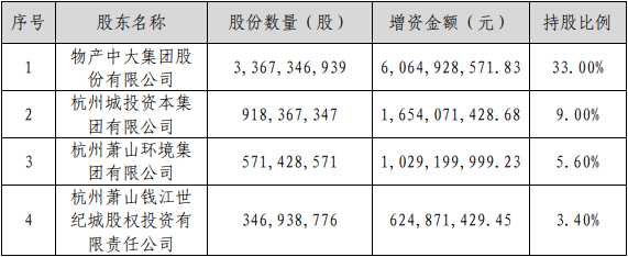2023年10月,信泰保险发布关于变更注册资本有关情况的信息披露公告,拟新增注册资本52.04亿元,增资金额为93.73亿元。本次新增注册资本全部由4家新增股东认购。其中,物产中大增资60.65亿元,持股比例33.00%;杭州城投资本集团有限公司增资16.54亿元,持股比例9.00%;杭州萧山环境集团有限公司增资10.29亿元,持股比例5.60%;杭州萧山钱江世纪城股权投资有限责任公司增资6.25亿元,持股比例3.40%。