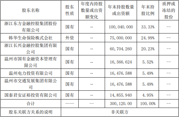 截至2023年9月30日,中韩人寿控股股东为浙江东方金融控股集团股份有限公司,持股比例为33.33%;韩华生命保险株式会社为该公司第二大股东,持股比例为24.99%;浙江长兴金融控股集团有限公司为该公司第三大股东,持股比例为20.23%。中韩人寿的实际控制人为浙江省人民政府国有资产监督管理委员会。