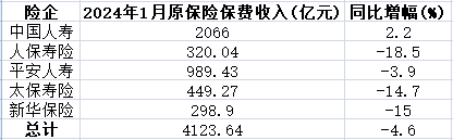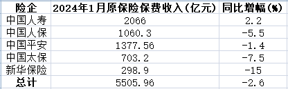 1月份A股5大险企共揽保费5506亿元 新华保险降15%