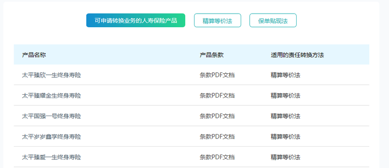 如太平人寿,目前官网显示共13款人寿保险产品可申请转化长期护理保险责任,转换均采用精算等价法。