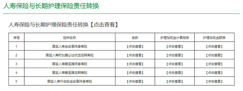试点一年,多家保险公司已经动作落地,包括太平人寿、人保寿险、国宝人寿等机构,在官网披露人寿保险与长期护理保险责任转换的具体产品和具体如精算等价法、保单贴现法等具体责任转换方法。