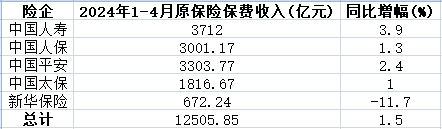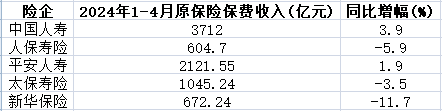 今年1月至4月,中国人寿、中国人保、中国平安、中国太保和新华保险保费收入分别为3712亿元、3001.17亿元、3303.77亿元、1816.67亿元和672.24亿元。