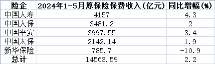 A股5险企前5月保费共1.46万亿 4家升新华保险降10.9%