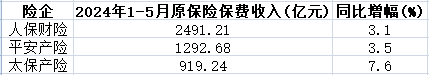 不用于寿险业务保费收入分化格局,“老三家”财产险保费收入整体增速稳定。前5个月,人保财险、平安产险和太保产险分别实现保费收入2491.21亿元、1292.68亿元和919.24亿元,同比增幅分别为3.1%、3.5%和7.6%,较1月至4月增速分别上涨0.3个百分点、上涨0.4个百分点和下降0.2个百分点。