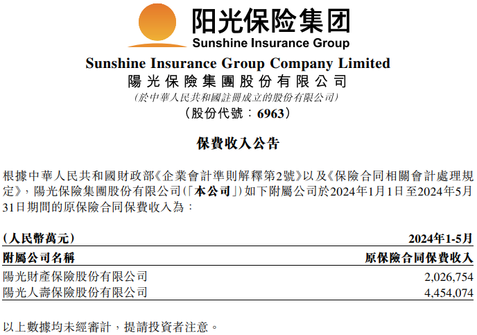 2024年1月至5月,阳光保险附属公司阳光财产保险股份有限公司实现原保险合同保费收入202.68亿元,附属公司阳光人寿保险股份有限公司实现原保险合同保费收入445.41亿元。