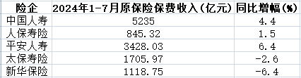 具体来看,前7个月,中国人寿、中国人保、中国平安、中国太保和新华保险分别实现保费收入5235亿元、4680.45亿元、5508.66亿元、2982.47亿元和1118.75亿元,同比变动分别为4.4%、3.9%、5.7%、1.5%和-6.4%。