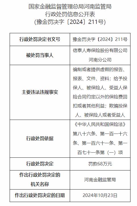 中国经济网北京11月1日讯 国家金融监督管理总局网站近日公布的国家金融监督管理总局河南监管局行政处罚信息公开表(豫金罚决字〔2024〕211号)显示,信泰人寿保险股份有限公司河南分公司存在以下违法违规事实:编制或者提供虚假的报告、报表、文件、资料;给予投保人、被保险人、受益人保险合同约定以外的保险费回扣或者其他利益;欺骗投保人、被保险人或者受益人。根据《中华人民共和国保险法》第八十六条、第一百一十六条、第一百六十一条、第一百七十一条第(一)项的规定,河南金融监管局决定对其处以罚款68万元。