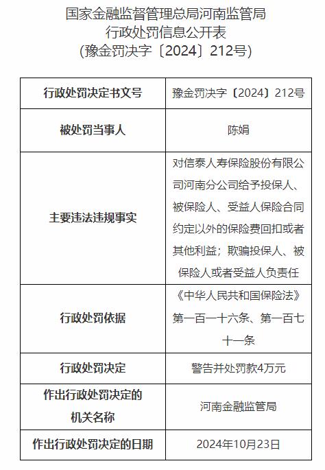 国家金融监督管理总局河南监管局行政处罚信息公开表(豫金罚决字〔2024〕212号)显示,陈娟对信泰人寿保险股份有限公司河南分公司给予投保人、被保险人、受益人保险合同约定以外的保险费回扣或者其他利益;欺骗投保人、被保险人或者受益人负责任。根据《中华人民共和国保险法》第一百一十六条、第一百七十一条的规定,河南金融监管局决定对其处以警告并处罚款4万元。