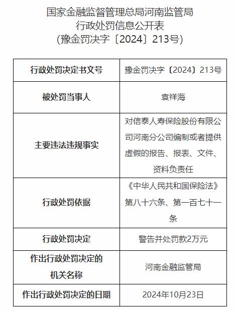 国家金融监督管理总局河南监管局行政处罚信息公开表(豫金罚决字〔2024〕213号)显示,袁祥海对信泰人寿保险股份有限公司河南分公司编制或者提供虚假的报告、报表、文件、资料负责任。根据《中华人民共和国保险法》第八十六条、第一百七十一条的规定,河南金融监管局决定对其处以警告并处罚款2万元。