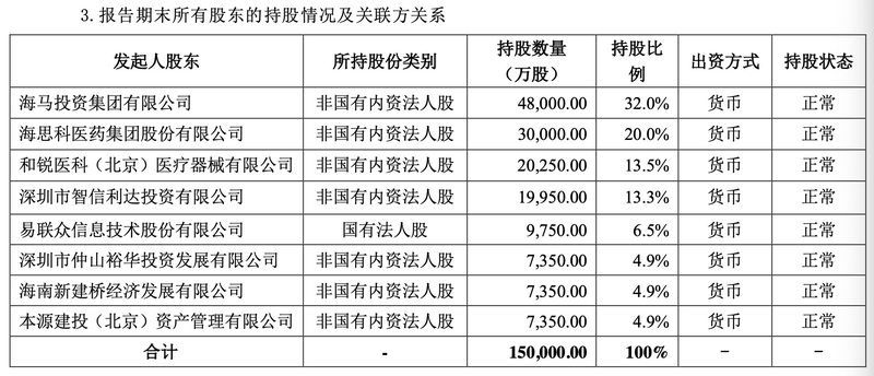 从海保人寿目前的股权结构来看,公司共有8家股东,其中海马集团为第一大股东,持股比例32%;海思科医药集团股份有限公司持股20%,和锐医科(北京)医疗器械有限公司、深圳市智信利达投资有限公司分别持股13.5%、13.3%;ST易联众持股6.5%,为海保人寿第五大股东。其余三家股东均持股4.9%。