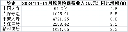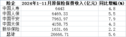 前11月,中国人寿实现保费收入6443亿元,同比增长4.8%;中国人保实现保费收入6469.33亿元,同比增长5.5%;中国平安实现保费收入7963.97亿元,同比增长7.9%;中国太保实现保费收入4158.75亿元,同比增长4.3%;新华保险实现保费收入1631.66亿元,同比增长2.2%。