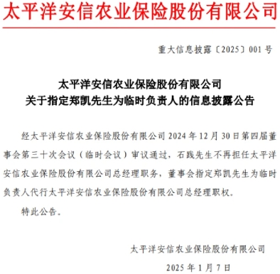 1月7日,太平洋安信农业保险股份有限公司(以下简称“太平洋安信农险”)发布公告称,经太平洋安信农险2024年12月30日第四届董事会第三十次会议(临时会议)审议通过,石践不再担任太平洋安信农险总经理职务,董事会已指定郑凯为临时负责人代行总经理职权。