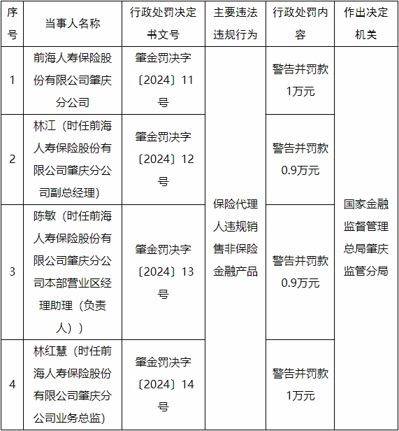 国家金融监督管理总局肇庆监管分局对前海人寿保险股份有限公司肇庆分公司警告并罚款1万元,对林江警告并罚款0.9万元,对陈敏警告并罚款0.9万元,对林红慧警告并罚款1万元。