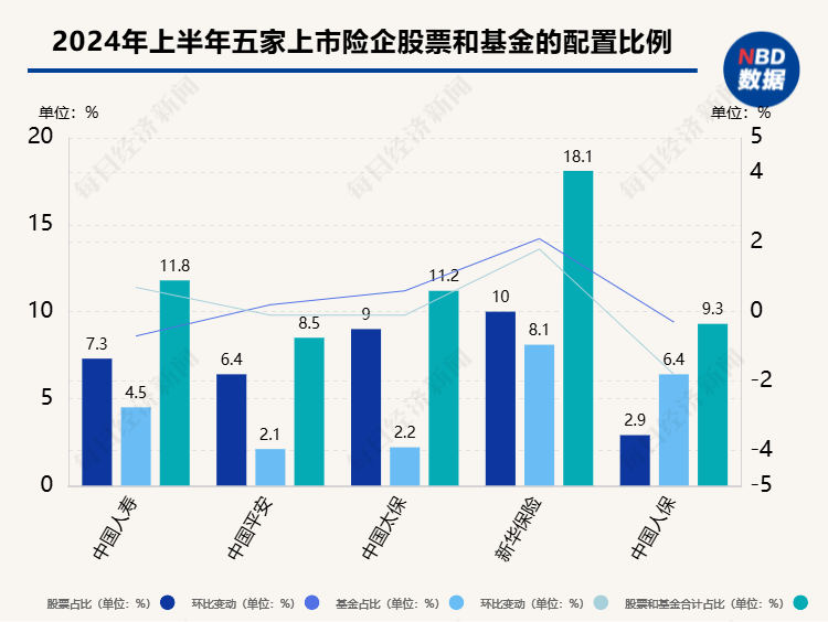 从上市险企权益资产配置的情况来看,截至2024年上半年,中国人寿、中国平安、中国太保、新华保险、中国人保对股票和基金的配置比例分别为11.8%、8.5%、11.2%、18.1%、9.3%。业内普遍认为,在长周期考核引导下,险资投资相关权益资产的配置比例有望进一步提升,A股将迎来增量耐心资本。