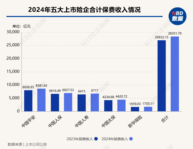 最新数据显示,2024年,中国平安(SH601318,股价50.37元,市值9172亿元)、中国人保(SH601319,股价7.07元,市值3126亿元)、中国人寿(SH601628,股价41.10元,市值1.16万亿元)、中国太保(SH601601,股价32.11元,市值3089亿元)、新华保险(SH601336,股价48.62元,市值1516亿元)五大上市险企合计保费收入达2.84万亿元,同比增长约5.3%。有业内人士在受访时称,每年新增保费的30%这一数字给市场释放了积极的信号。