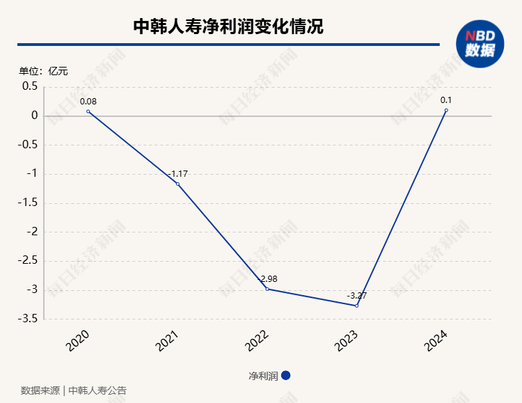 在股权、人事变动完成之后,中韩人寿近期正式获批更名为东方嘉富人寿。自成立以来,中韩人寿仅在2020年实现盈利,其余年份均处于亏损状态。财务数据显示,2012年至2023年中韩人寿分别实现净利润-0.21亿元、-0.56亿元、-0.74亿元、-0.93亿元、-1.34亿元、-1.42亿元、-1.19亿元、-1.46亿元、0.08亿元、-1.17亿元、-2.98亿元及-3.27亿元。