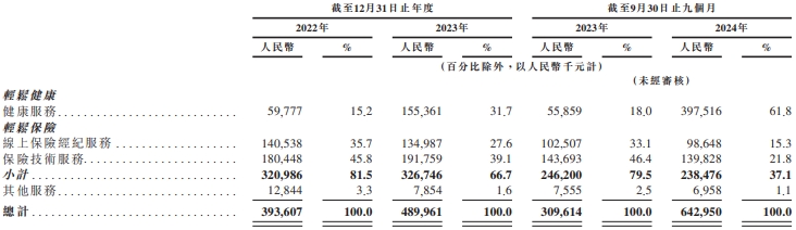 截至2024年9月30日,轻松保险已提供来自36家保险公司的252款保险产品。轻松保险为该公司贡献了大部分收入,2022年、2023年及截至2024年9月30日止九个月,轻松健康集团总收入的81.5%、66.7%及37.1%来自轻松保险服务。