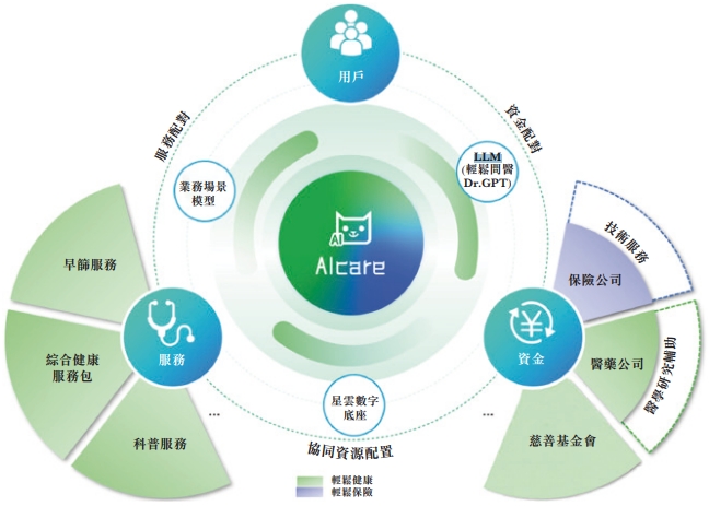AIcare技术栈作为核心引擎,支撑全方位健康生态系统的高效运作。其星云数字底座整合了医疗资源、保险数据及用户行为,通过LLM(大语言模型)及算法实现资源智能匹配。例如,“轻松问医Dr.GPT”应用自然语言处理技术,为用户提供健康咨询;资金配对模型则实时连接用户保障需求与保险产品,形成服务闭环。