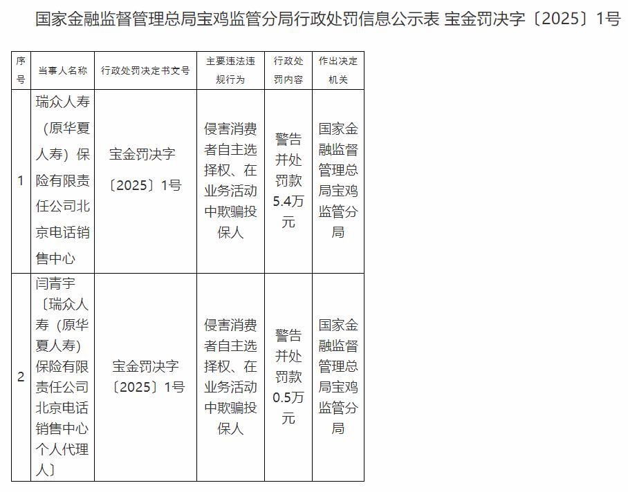 国家金融监督管理总局宝鸡监管分局决定对瑞众人寿(原华夏人寿)保险有限责任公司北京电话销售中心警告并处罚款5.4万元,对闫青宇警告并处罚款0.5万元。