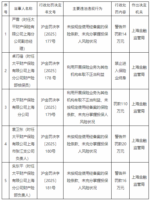 中国经济网北京11月1日讯 国家金融监督管理总局上海监管局网站昨日披露的行政处罚信息公开表(沪金罚决字〔2025〕177-181号)显示,太平财产保险有限公司上海分公司存在如下主要违法违规行为:利用开展保险业务为其他机构牟取不正当利益、未按规定使用经备案的保险条款、未充分掌握投保人风险状况。上海金融监管局对其罚款110万元。3名相关责任人被警告,并被罚款共计50万元,另有1名责任人被禁止进入保险业终身。