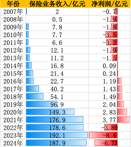 表1 2007—2024年英大人寿保险业务收入及净利润