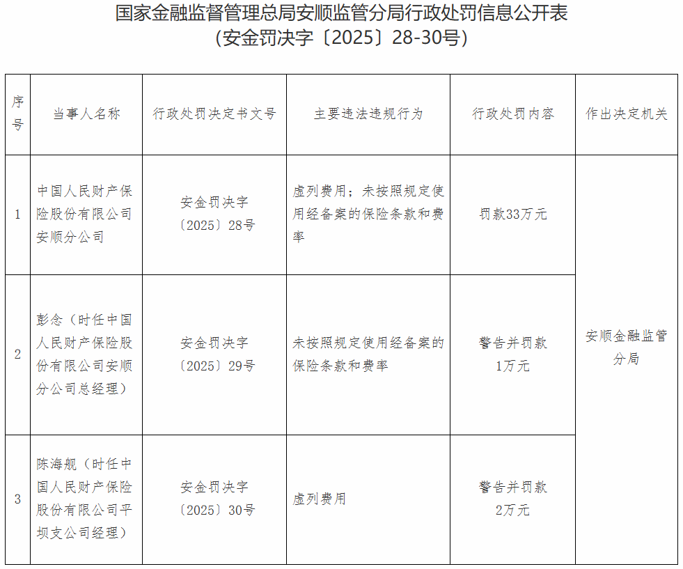 中国经济网北京12月25日讯 国家金融监督管理总局网站昨日公布的安顺监管分局行政处罚信息公开表(安金罚决字〔2025〕28-30号)显示,中国人民财产保险股份有限公司安顺分公司虚列费用;未按照规定使用经备案的保险条款和费率。安顺金融监管分局对其罚款33万元。