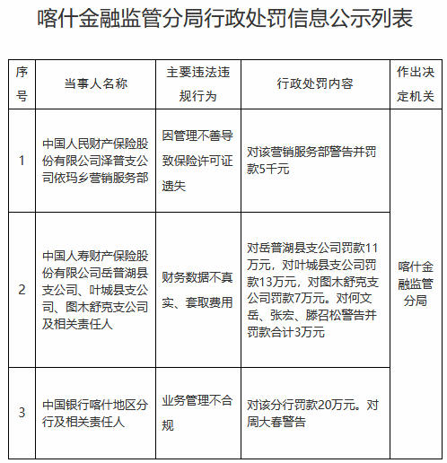 中国经济网北京12月31日讯 国家金融监督管理总局网站近日公布的喀什金融监管分局行政处罚信息公示列表显示,中国人民财产保险股份有限公司泽普支公司依玛乡营销服务部因管理不善导致保险许可证遗失。喀什金融监管分局对该营销服务部警告并罚款5千元。