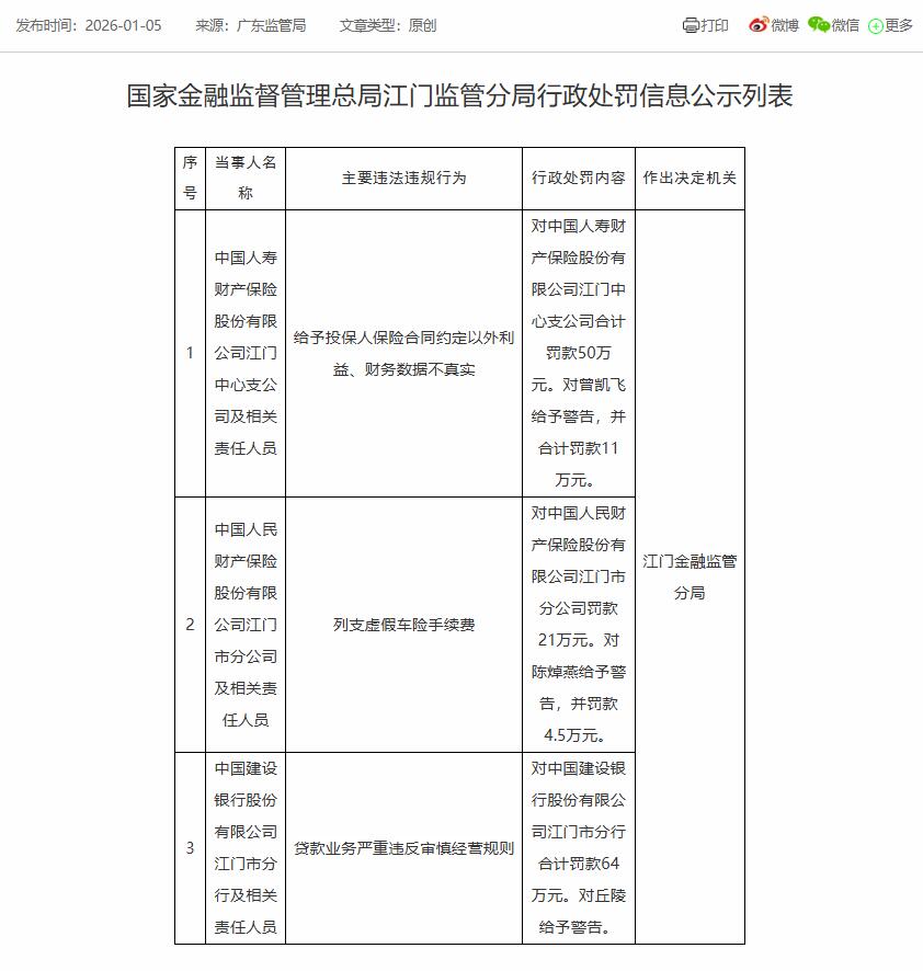 中国经济网北京1月7日讯 国家金融监督管理总局网站1月5日公布的江门监管分局行政处罚信息公示列表显示,中国人民财产保险股份有限公司江门市分公司及相关责任人员列支虚假车险手续费。