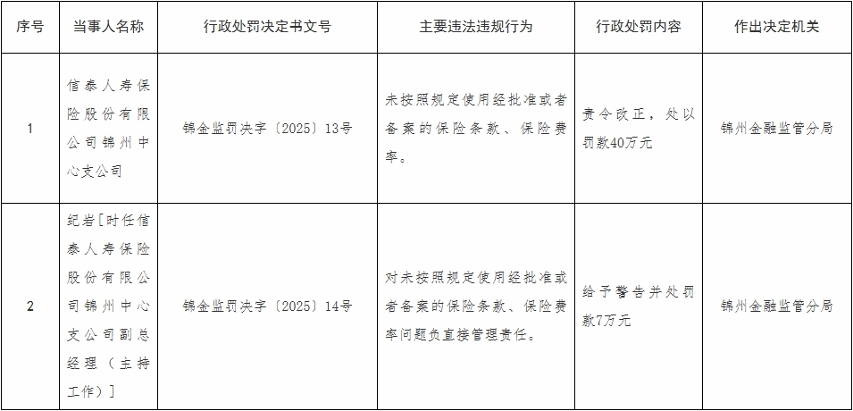 锦州金融监管分局依据相关法律法规,对信泰人寿保险股份有限公司锦州中心支公司责令改正,处以罚款40万元;对纪岩给予警告并处罚款7万元。