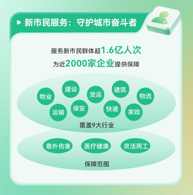 在新市民服务方面,众安保险累计服务新市民群体超1.6亿人次,为近2000家企业提供保障,覆盖物业、建设、快递、建材、物流等9大行业,助力城市建设者安居乐业,为社会民生筑牢保障基石。