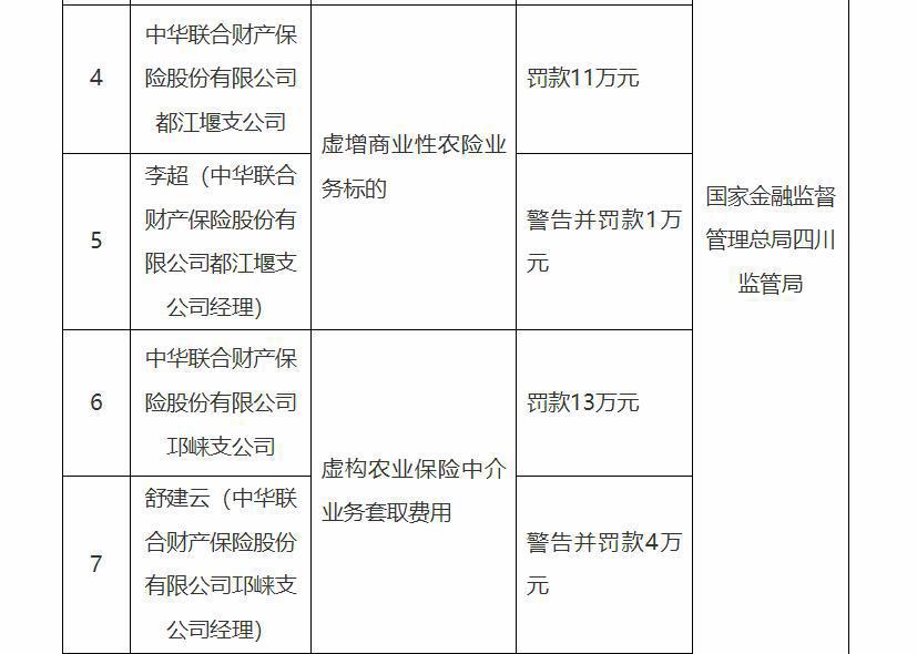 中华财险邛崃支公司因虚构农业保险中介业务套取费用,被罚款13万元;经理舒建云被警告并罚款4万元。