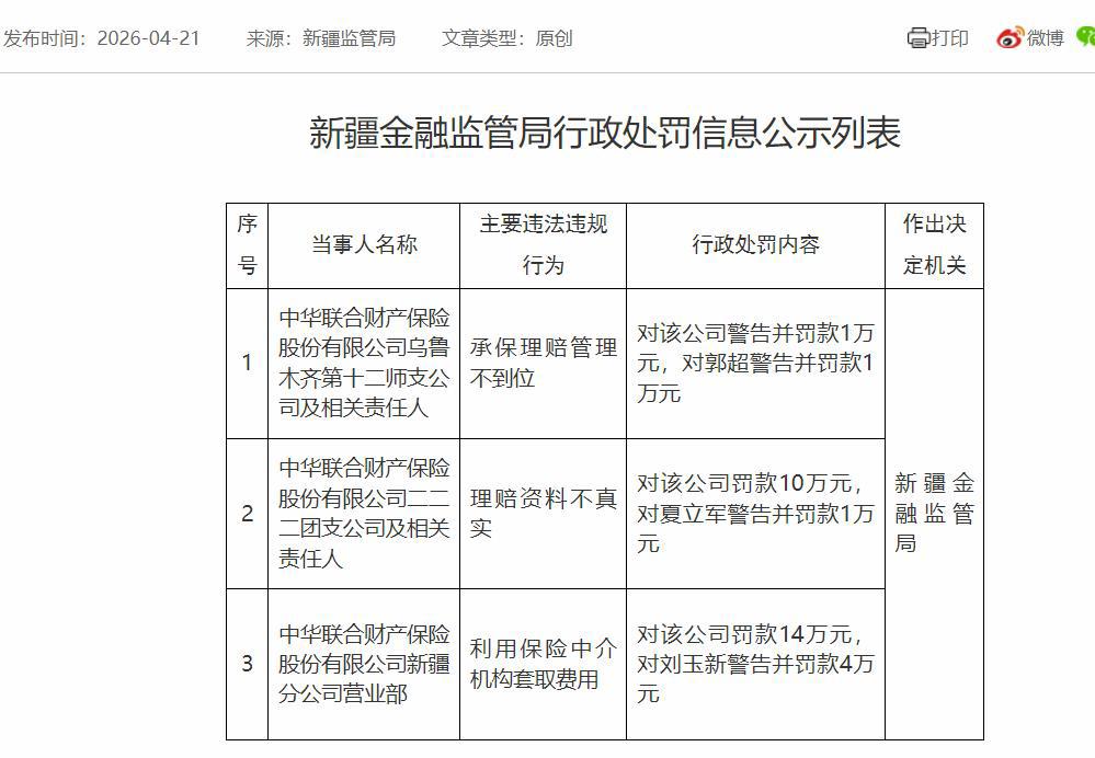 国家金融监督管理总局新疆监管局近日公示行政处罚信息,中华联合财产保险股份有限公司在新疆的三家分支机构因多项违规行为合计被罚25万元,相关责任人同步受到处罚。