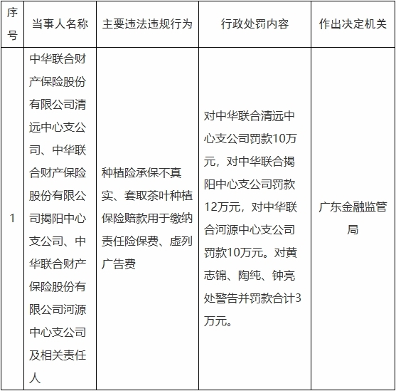广东金融监管局对中华联合清远中心支公司罚款10万元,对中华联合揭阳中心支公司罚款12万元,对中华联合河源中心支公司罚款10万元。对黄志锦、陶纯、钟亮处警告并罚款合计3万元。