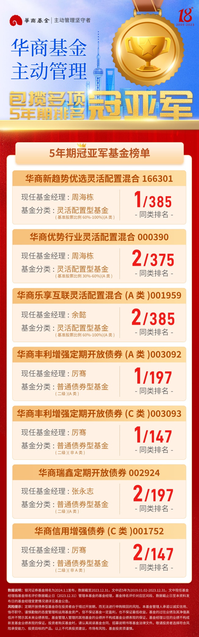2023年已经过去,银河证券数据显示,截至2023年底,近5年华商基金旗下多只权益类、固收类基金在同类基金排名中名列前茅,一举包揽多项基金分类冠亚军,彰显了华商基金“主动管理坚守者”的实力与担当。