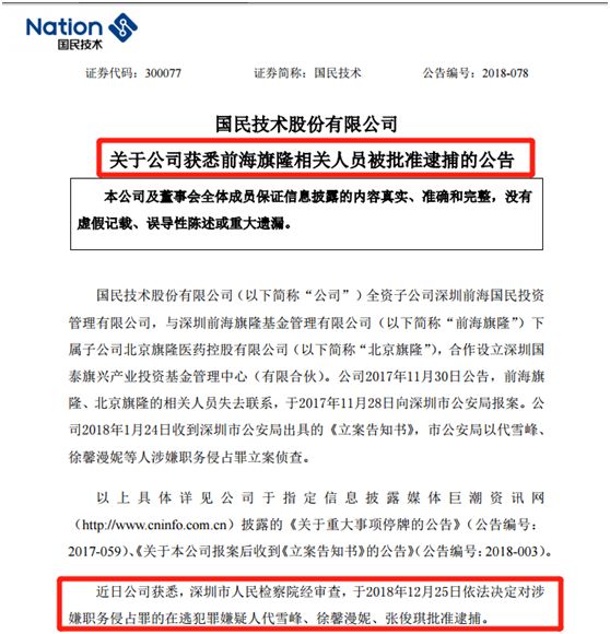 终于到近日,国民技术收到消息称:深圳市人民检察院经审查,于2018年12月25日依法决定对涉嫌职务侵占罪的在逃犯罪嫌疑人代雪峰、徐馨漫妮、张俊琪批准逮捕。
