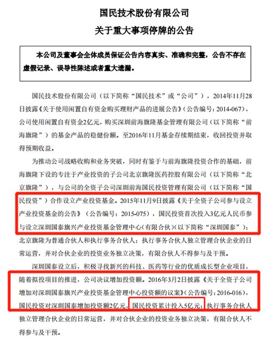 此前国民技术旗下子公司和私募前海旗隆合作设立产业投资基金,在累计投入5亿元后,在去年底发现和前海旗隆的相关人员失去联系,即跑路了。