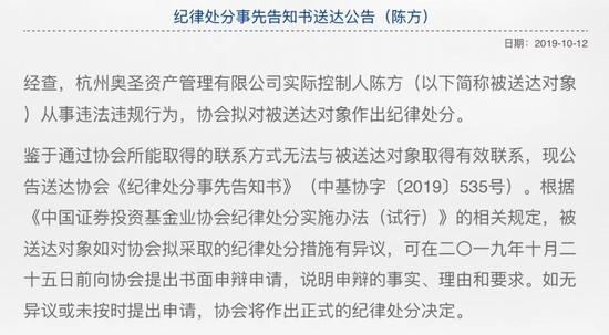 此外,中基协还发现奥圣资产存在四大违法违规情况:一是该公司虚假填报登记信息;二是未按规定向协会备案基金;三是未向协会报告实控人被采取刑事强制措施等重大事项;四是陈方不具备基金从业资格,却从事私募证券投资基金业务。由于“情节严重、性质恶劣”,协会拟将陈方加入黑名单,期限为终身。