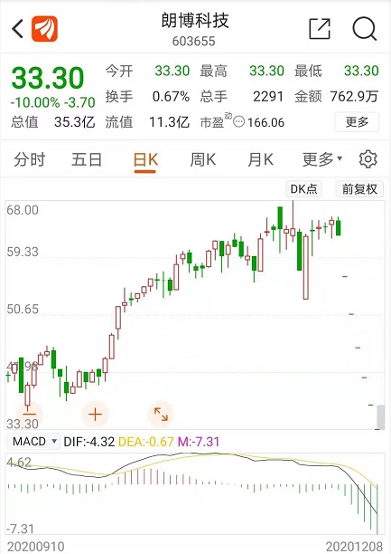 但从走势看,朗博科技大有复制仁东控股暴涨后,连续一字断魂刀闪崩的趋势。从近1年的日K线图来看,朗博科技也是“大牛股”:从去年12月的均价17元/股左右,迅速攀升到11月19日的盘中历史高点68元/股,涨幅最高超3倍。