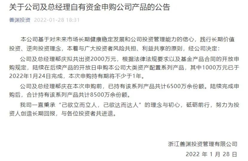 此前,在1月28日,节前最后一个交易日,善渊投资还发声,表示要主动申购2000万的产品,其中1000万元已于2022年1月24日完成。