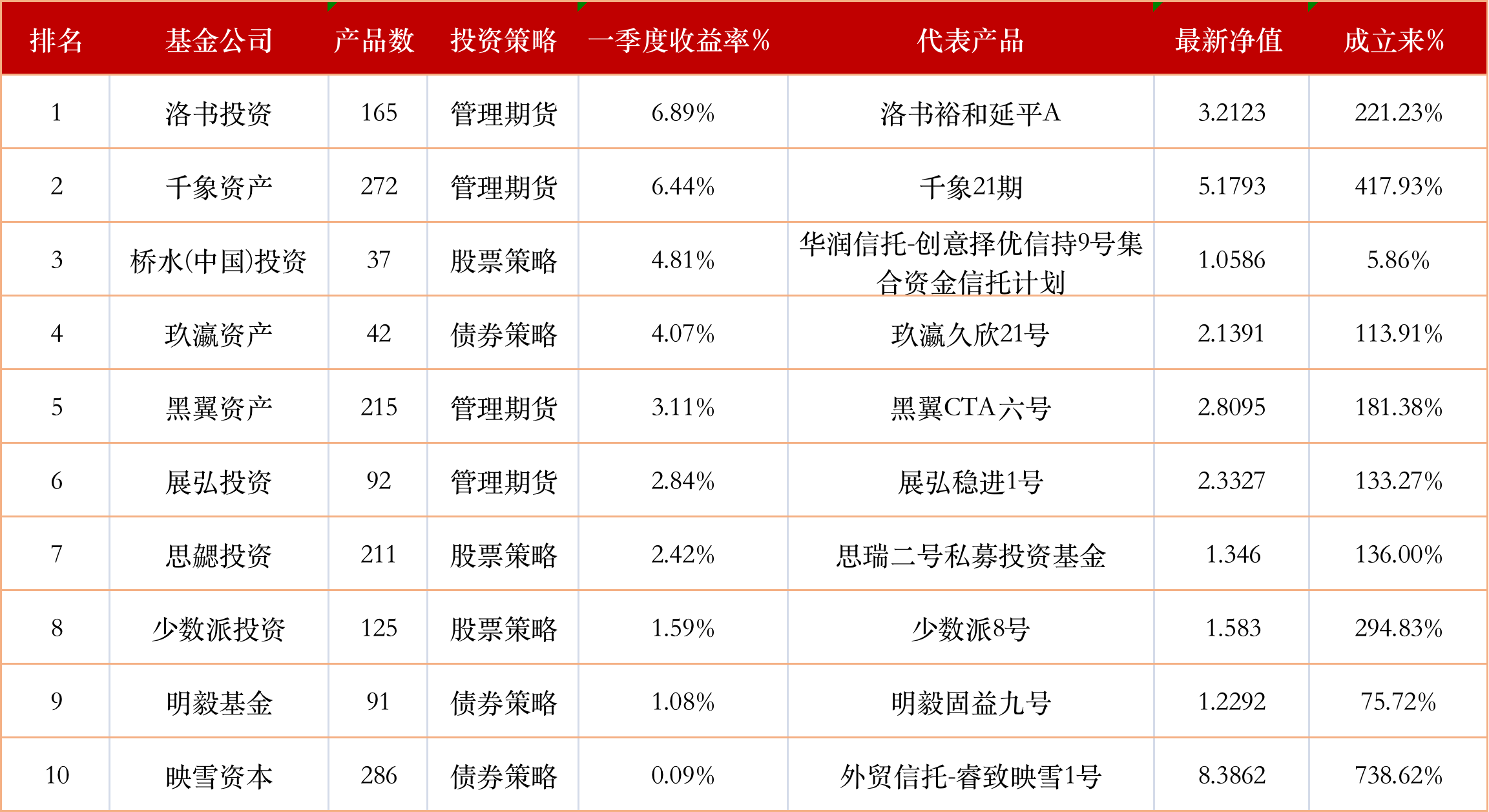 今年一季度,包括洛书投资、千象资产、桥水(中国)投资、玖瀛资产、黑翼资产在内的10家百亿私募实现正收益,在百亿私募中占比约一成。