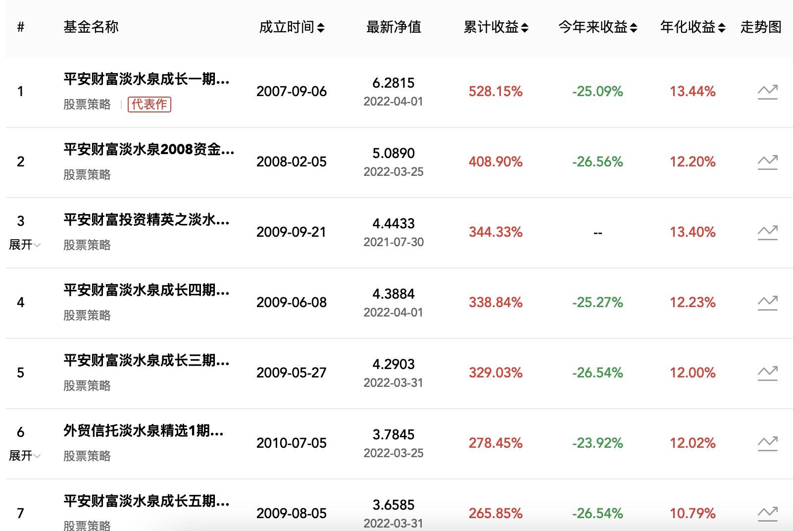 淡水泉旗下产品同样哀鸿遍野,已披露净值数据的215只产品一季度全部亏损,跌幅超过20%的有159只。其代表作“平安财富淡水泉成长一期集合资金信托”今年亏25.09%,该产品2007年成立以来累计收益率528.15%,期间最大回撤42.81%,出现在今年3月15日。