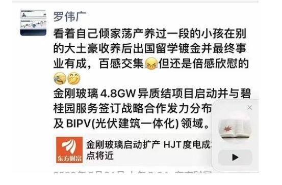 6月24日,罗伟广在朋友圈叹息道:“看着自己倾家荡产养过一段的小孩在别的大土豪收养后出国留学镀金并最终事业有成,百感交集,但还是倍感欣慰的。”
